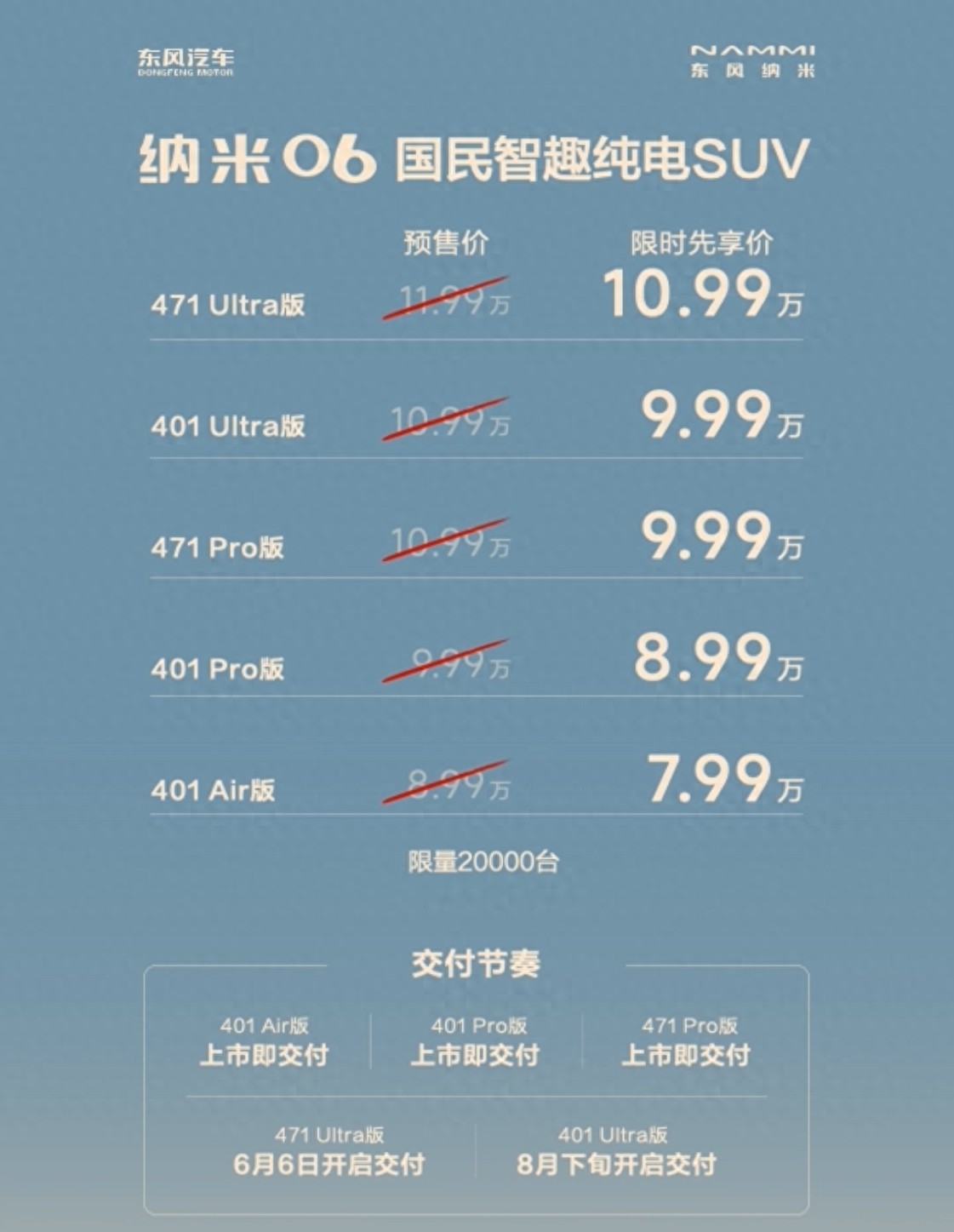 5月27日,東風納米品牌全新車型納米06正式上市,新車定位為小型純電SUV,共推出5款配置,限時先享價7.99-10.99萬元。