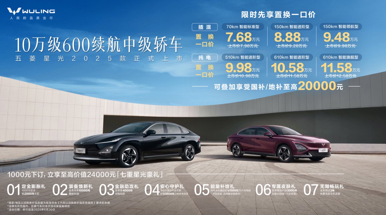在2025年6月30日前,在五菱汽車(chē)官方渠道以1000元下訂,還可享至高價(jià)值24000元的「七重星光豪禮」,包括定金膨脹禮:1000元定金抵2000元車(chē)款;裝備煥新禮:全系至高10000元置換補(bǔ)貼;金融助攻禮:全系享4000元金融貼息;安心守護(hù)禮:首任非營(yíng)運(yùn)車(chē)主享價(jià)值3000元三電終身質(zhì)保;能量補(bǔ)給禮:純電車(chē)型贈(zèng)送價(jià)值1500元7kW充電樁(不含安裝,且具備安裝條件);專(zhuān)屬皮膚禮:全系贈(zèng)送價(jià)值3000元龍膜太陽(yáng)膜(不含安裝);無(wú)限暢玩禮:全系贈(zèng)送3年免費(fèi)無(wú)限車(chē)機(jī)流量。