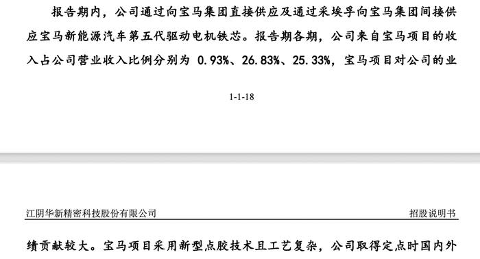 值得一提的是,報告期內,公司通過向寶馬集團直接供應及通過采埃孚向寶馬集團間接供應寶馬新能源汽車第五代驅動電機鐵芯。報告期各期,公司來自寶馬項目的收入占公司營業收入比例分別為0.93%、26.83%、25.33%,寶馬項目對公司的業績貢獻較大。