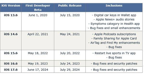 回顧歷史,蘋果通常會在每年6月或7月發(fā)布iOS系統(tǒng)的“.6”版本更新。例如,iOS 13.6于2020年6月1日發(fā)布首個開發(fā)者測試版,并于同年7月15日正式推送;iOS 17.6則是在2024年6月17日開啟測試,最終于7月29日正式上線。按照這一節(jié)奏推斷,iOS 18.6的正式發(fā)布時間很可能也在今年7月。