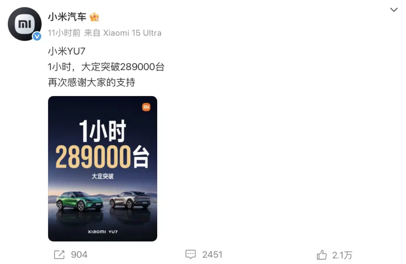 小米YU7昨晚發布后的媒體采訪間內,雷軍剛剛進場沒說兩分鐘,就被工作人員遞上的一個手機打斷,上面是小米汽車官方統計的實時戰報:當晚10點開售后,3分鐘內小米YU7大定破20萬臺,開售1小時后大定突破了289000臺。