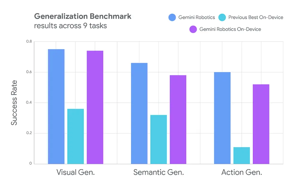 演示之外,基礎跑分數據上,Gemini Robotics On-Device也有不俗的表現。