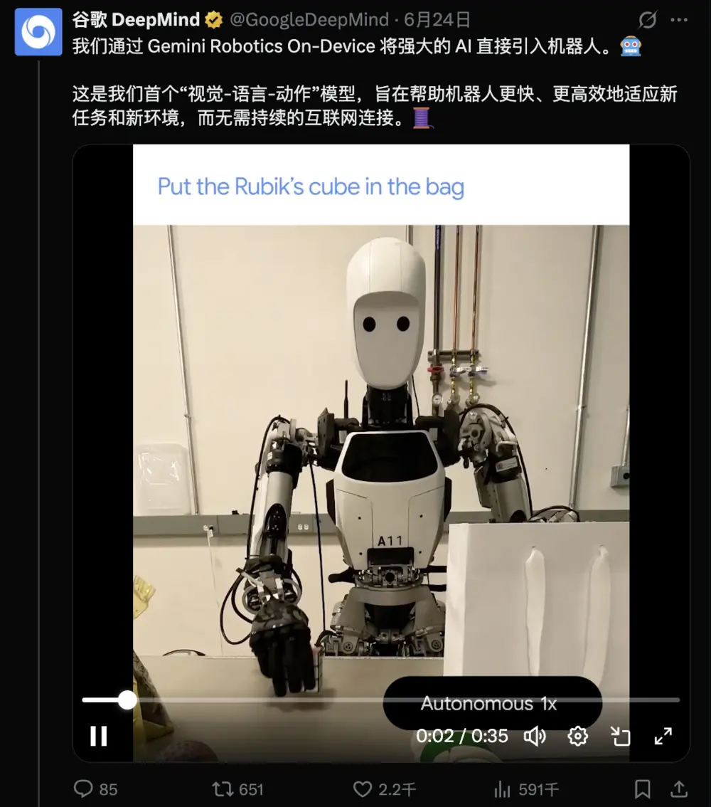 兩天前的洛杉磯,運行著Gemini Robotics On-Device 模型的機器人還在RSS2025(機器人軟件與系統大會)上完成了全球首個互動式現場展示。硅谷AI觀察人士Ted Xiao表示,“它仿佛是對未來的神奇一瞥——只需與你的機器人對話,它就會做出適當的回應,并嘗試執行一些合理的操作。新的物體、新的命令、新的技能。”