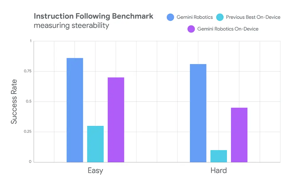 而在分布式任務和復雜的多步驟指令方面,Gemini Robotics On-Device 模型的表現也優于其他設備端替代方案。