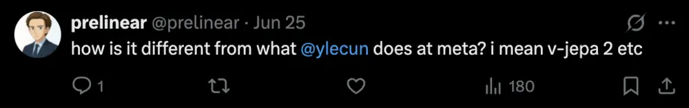 當然,也有網友并不買賬。提問這和特斯拉機器人的設計有什么不同,又和ylecun在Meta所做的工作有什么不一樣。