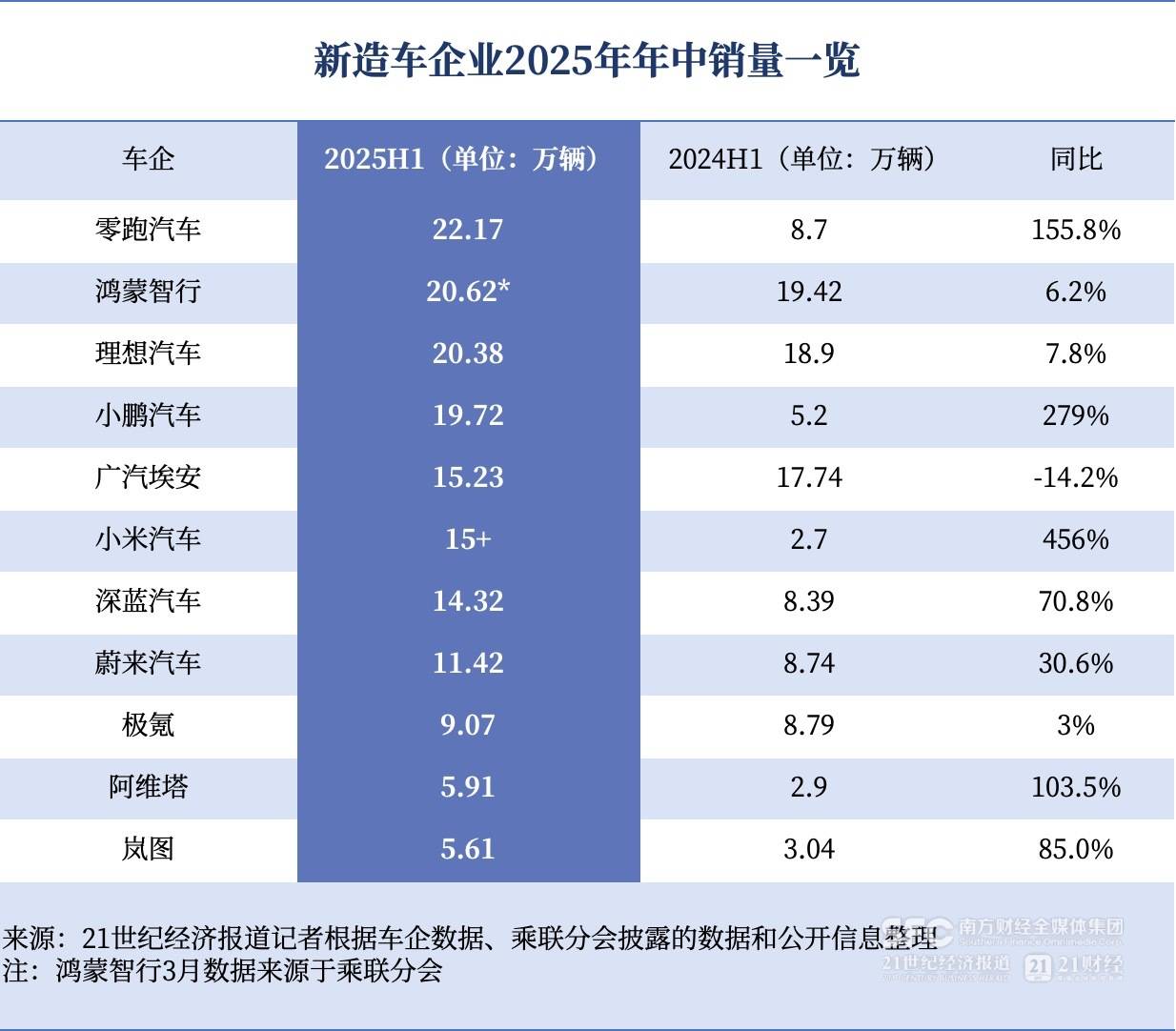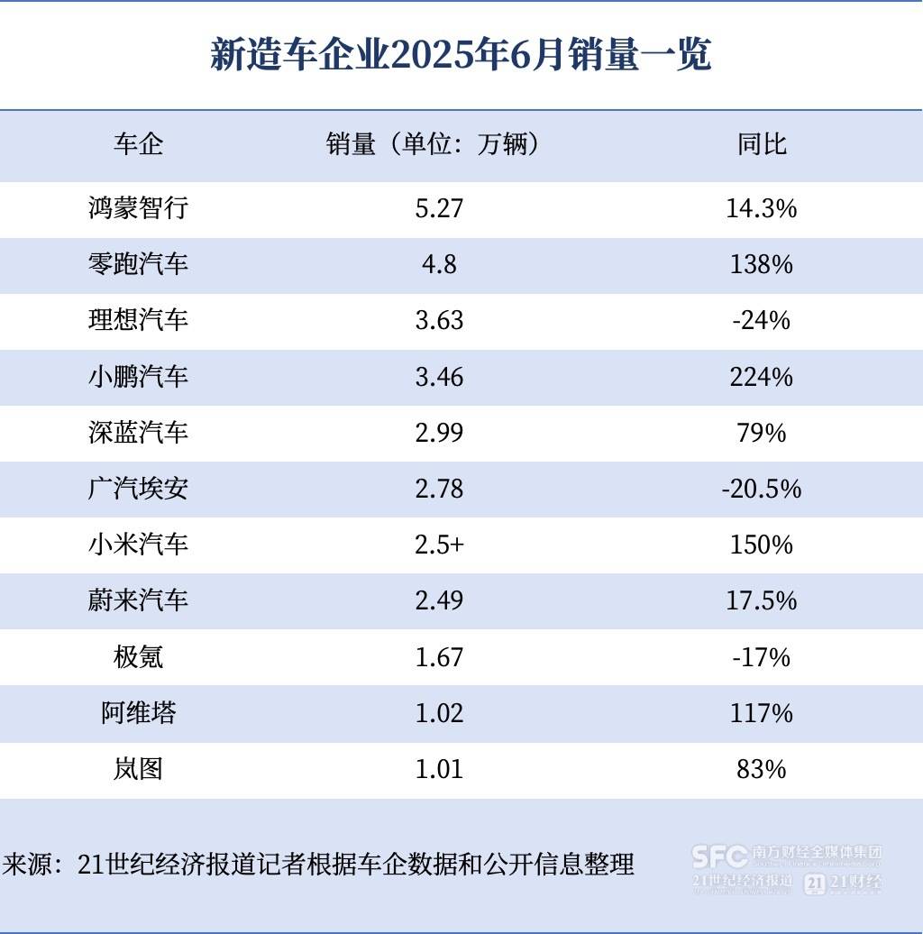 今年上半年,盡管新造車企業(yè)銷量整體同比增長居多,但除了鴻蒙智行、理想穩(wěn)居前三的第一梯隊外,其他車企也是幾家歡喜幾家愁:零跑沖入第一梯隊,小鵬躍升至第四,小米沖至腰部梯隊;廣汽埃安跌落至腰部,極氪、蔚來從腰部跌落至中后隊列,阿維塔、嵐圖依舊位列尾部梯隊。
