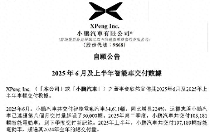 6月,小鵬汽車共交付智能電動汽車34611輛,同比增長224%,連續第八個月交付量超過30000輛。上半年,小鵬汽車共交付197189輛智能電動車,超過2024年全年的總交付量。