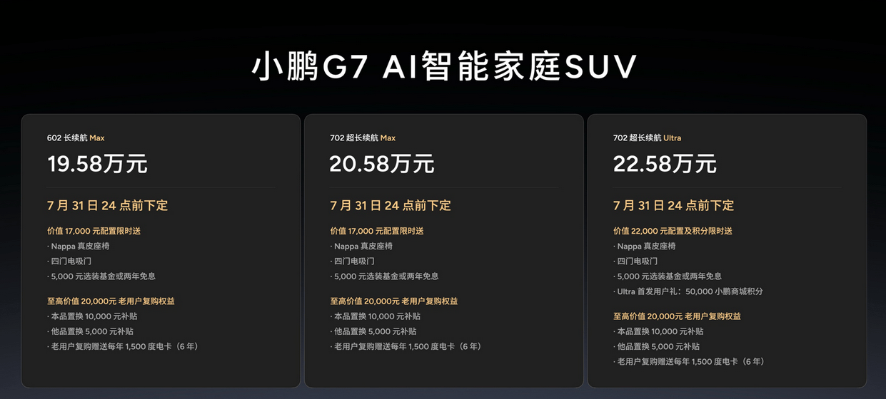 7月3日,全新智能家庭SUV小鵬G7正式上市了,新車共有602長續航Max、702超長續航Max、702超長續航Ultra三個版本,售價分別為19.58萬元、20.58萬元和22.58萬元,上市即交付,開售9分鐘大定破萬。