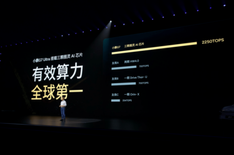 再看小鵬G7,從本次上市發布會就可以看出,人家鐵了心要在科技感上甩開對手:三顆圖靈AI芯片,算力超2200TOPS,跟華為合作的ARHUD,裝了VLM大模型的智能座艙,純視覺輔助駕駛路線。