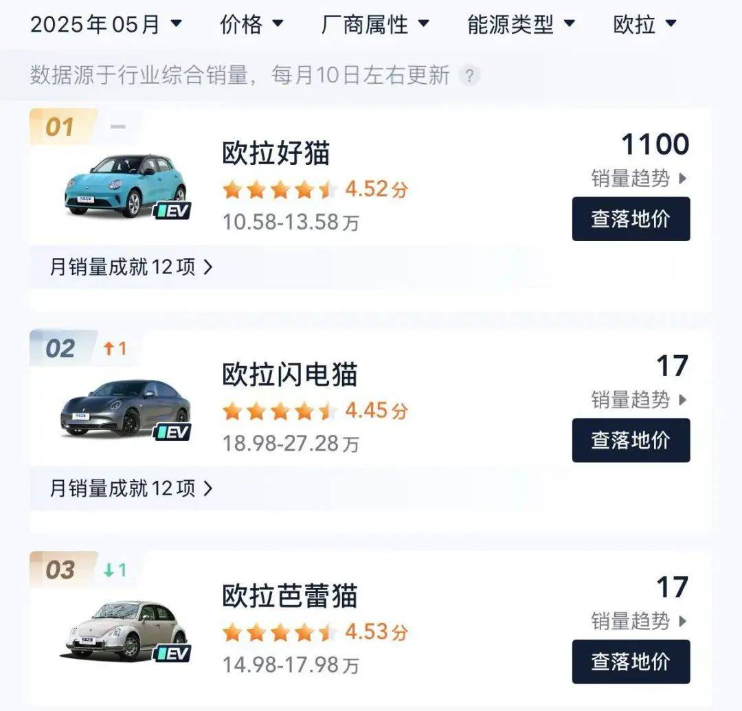 從市場(chǎng)層面看,去年歐拉整體銷量是6.33萬輛,同比下滑超過40%,今年前5個(gè)月,歐拉累計(jì)銷量是1萬出頭,同比下滑接近60%。根據(jù)第三方數(shù)據(jù)顯示,目前歐拉現(xiàn)有的四款車型中,只有歐拉好貓是走量款,月銷在一千左右,剩下三款歐拉閃電貓和歐拉芭蕾貓,以及好貓GT都只有忽略不計(jì)的銷售額。