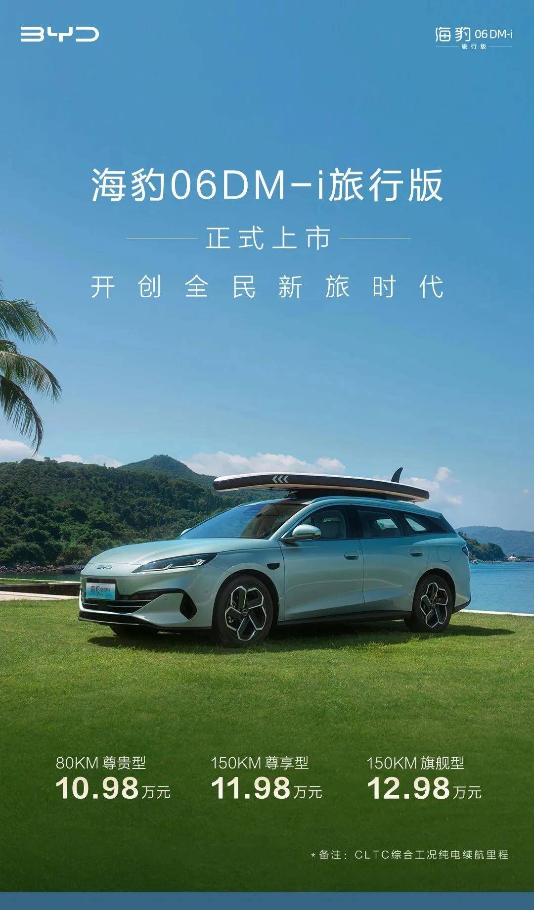 7月4日,海豹06DM-i旅行版正式上市,新車共推出3個車型版本,指導(dǎo)價10.98-12.98萬元。
