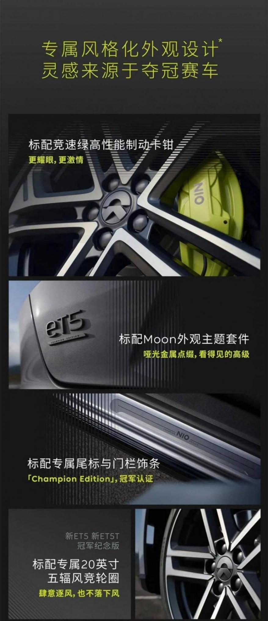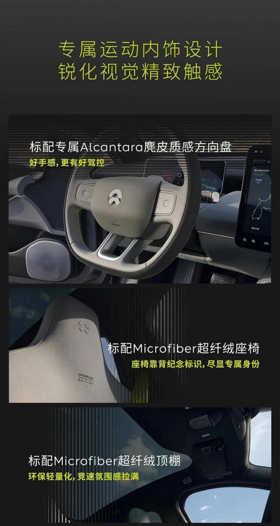 冠軍版車型是為了紀(jì)念蔚來2015年奪得Formula E電動方程式首個年度車手總冠軍十周年而打造的,擁有專屬的設(shè)計套裝以及底盤升級調(diào)校。