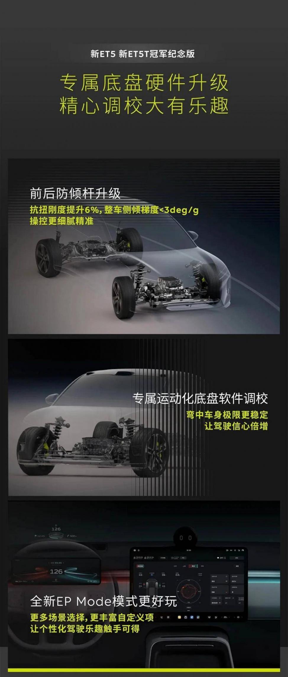 也就是說,ET5T冠軍紀(jì)念版車型的底盤設(shè)定會更有駕駛樂趣,配合上490Ps的最大功率以及700N·m的峰值扭矩,新ET5T冠軍紀(jì)念版車型將變得更加運動、好玩。