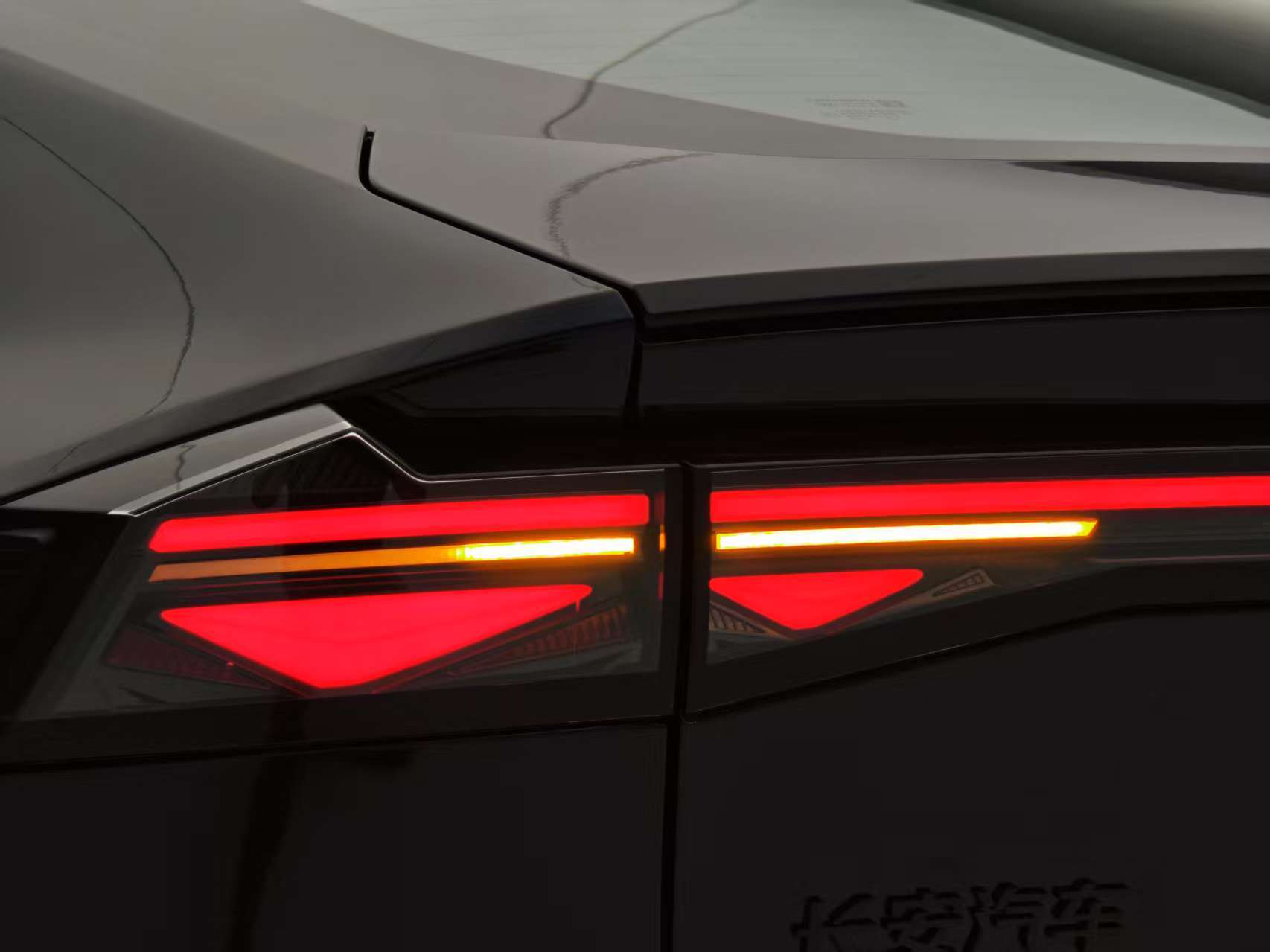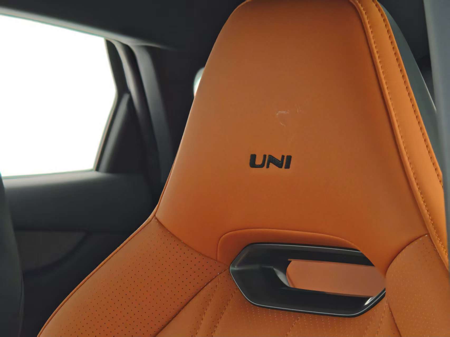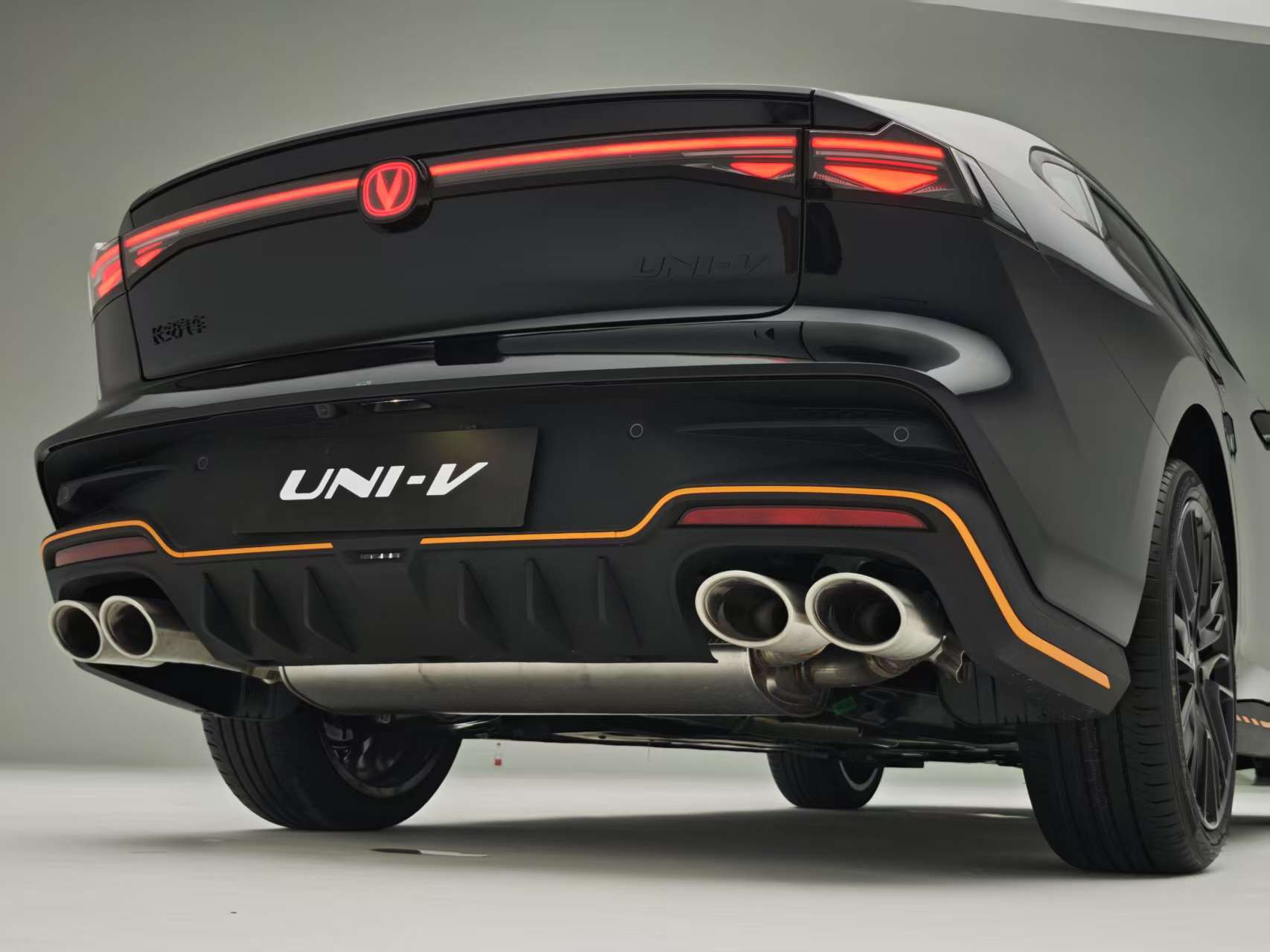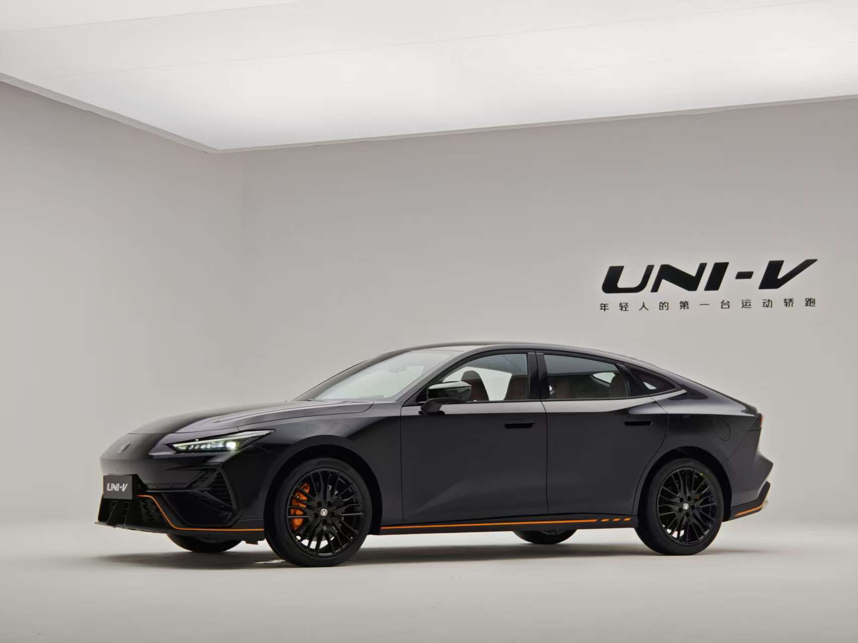 第三代UNI-V延續溜背轎跑輪廓,車身尺寸增至4740×1838×1430mm(軸距2750mm),風阻系數優化至0.27Cd。前臉革新尤為顯著:鯊魚鼻仿生設計取代此前的無邊界格柵,封閉曲面上嵌發光車標,下方梯形進氣口搭配三角形導流槽,橙黑飾條點綴的運動版更顯凌厲。