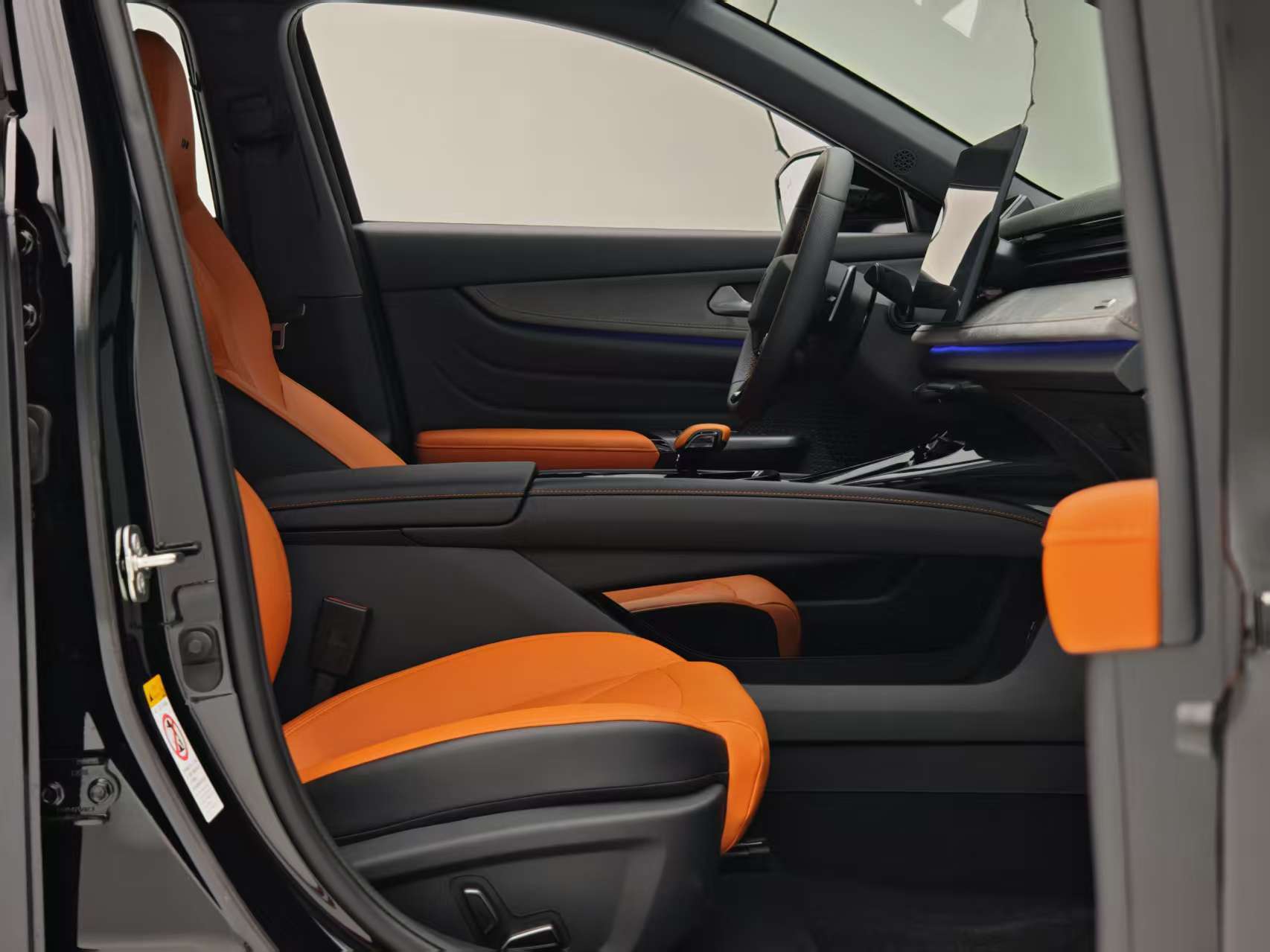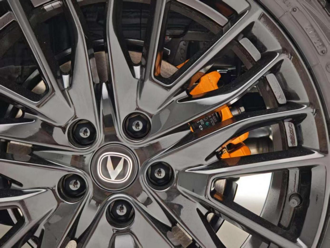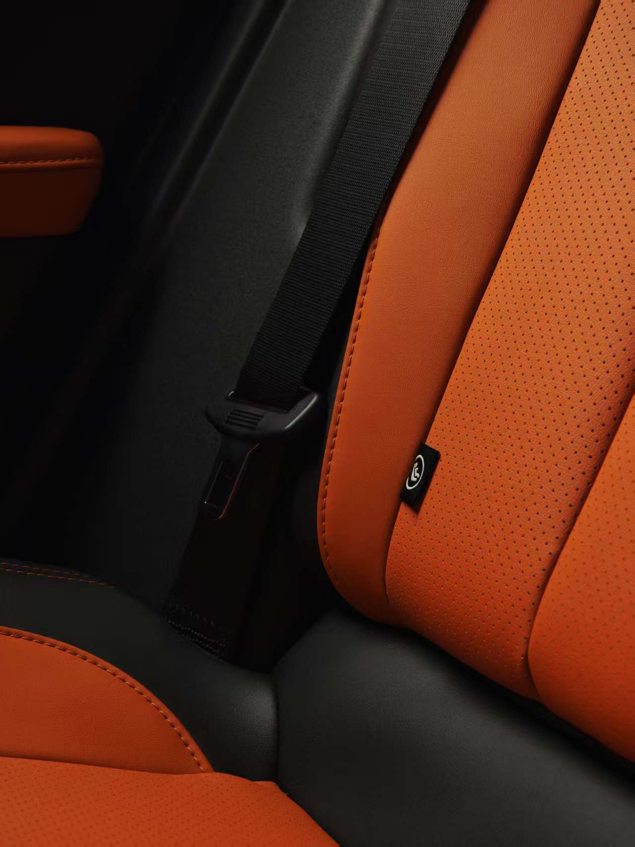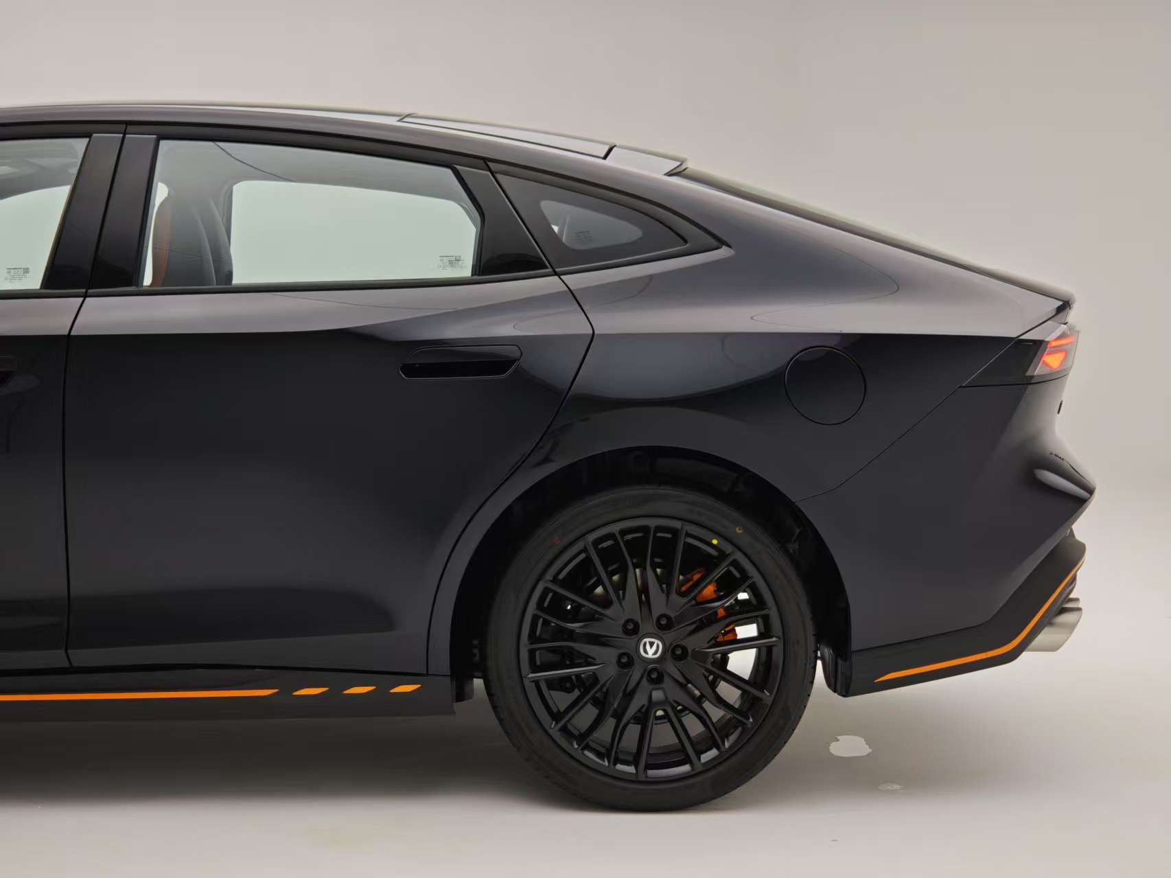 側身方面,半隱藏門把手與19英寸熏黑輪轂形成流暢曲面,橙色四活塞卡鉗與前350mm打孔剎車盤則暗藏性能底蘊。