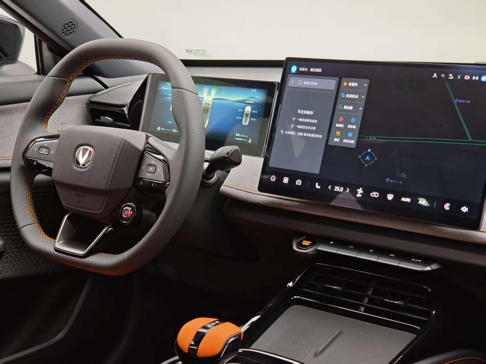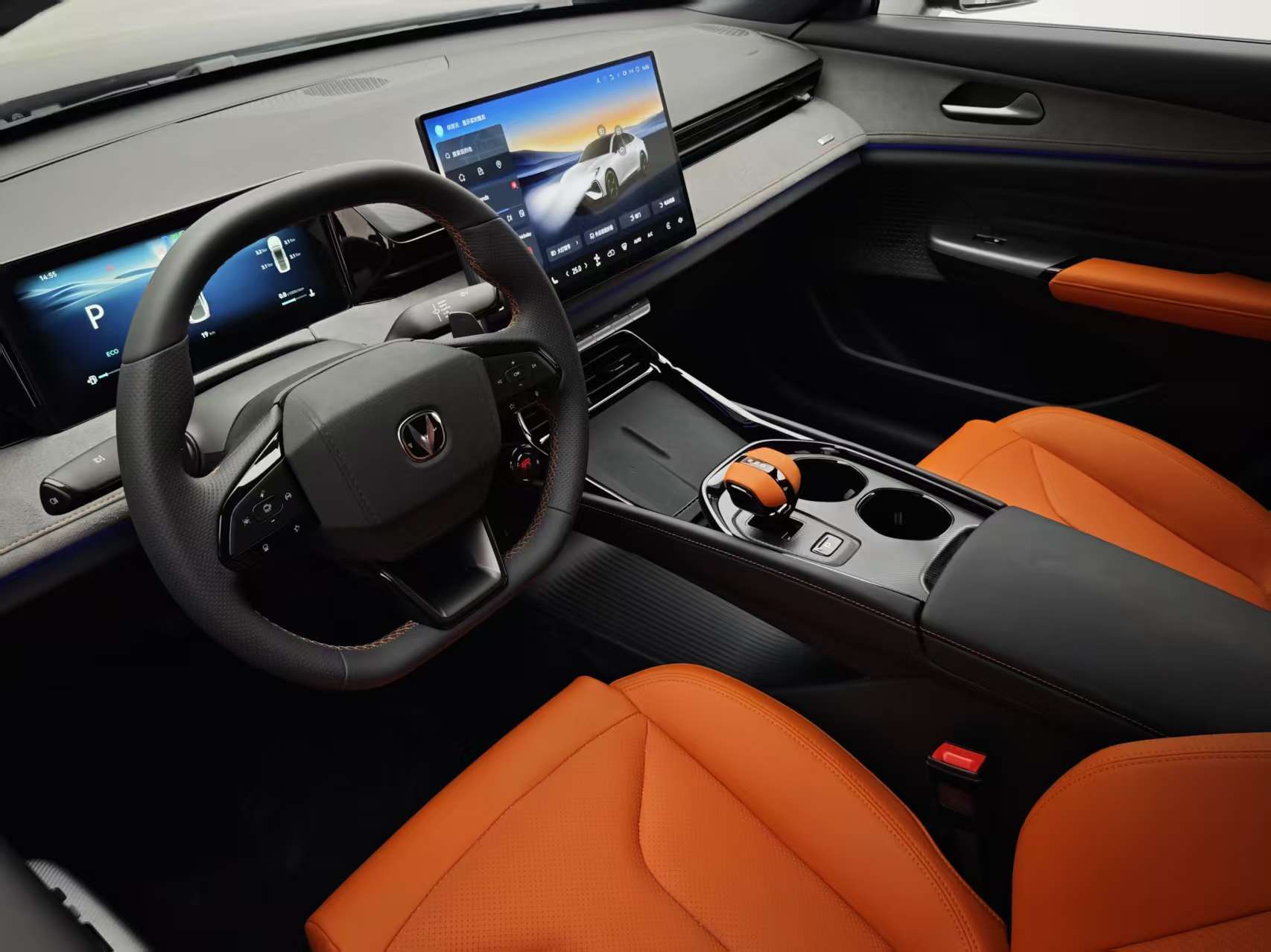 整車內飾風格向深藍SL03靠攏,懸浮式14.6英寸中控屏+全液晶儀表組成雙屏系統,保留物理按鍵確保操作便利。方向盤革新為雙D型運動設計,集成換擋撥片與“SUPER RACE 3.0”專屬物理按鍵,一鍵觸發賽道模式后,中控屏同步顯示G值、加速計時等功能,氛圍感拉滿。