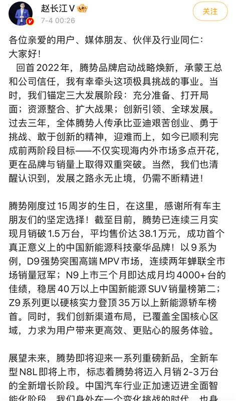 近日,原騰勢銷售事業部總經理趙長江發文告別騰勢,此舉被業內視為對此前“騰勢將進行人事調整”消息的正面回應。