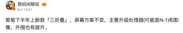 對于那個能折三下的新手機,還是同一個人以前說過,華為在今年下半年,會出一個新的Mate XT三折疊手機。屏幕可能還一樣,主要是拍照和芯片會升級一下。