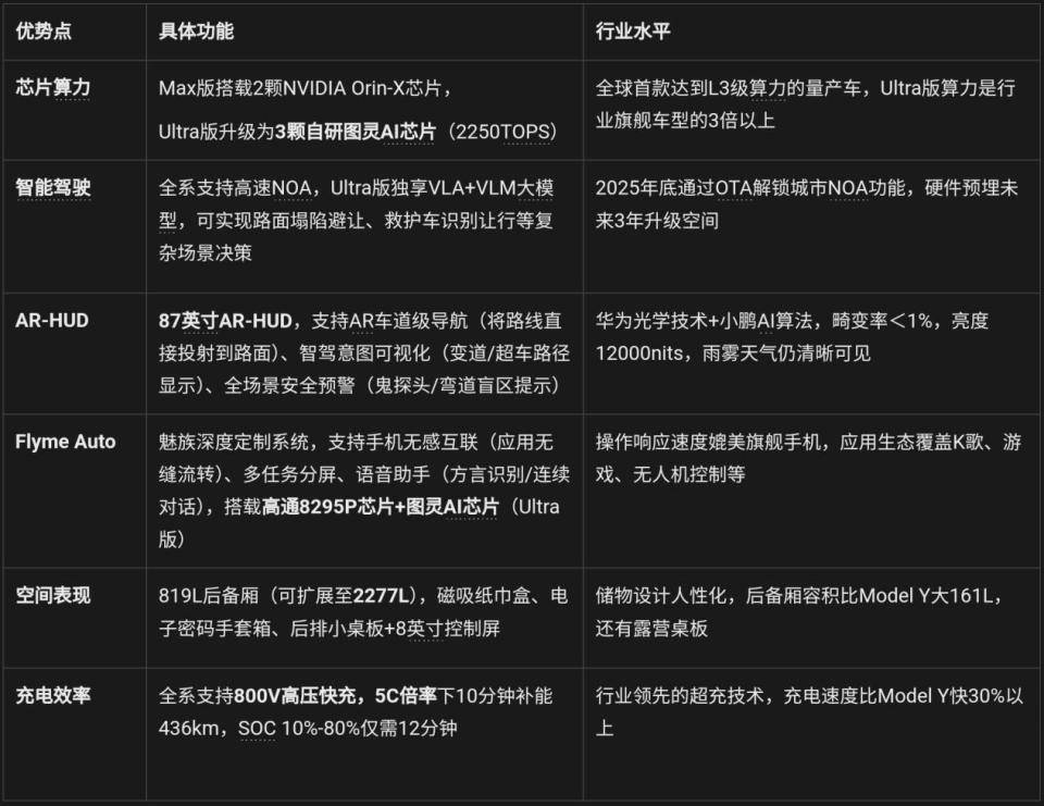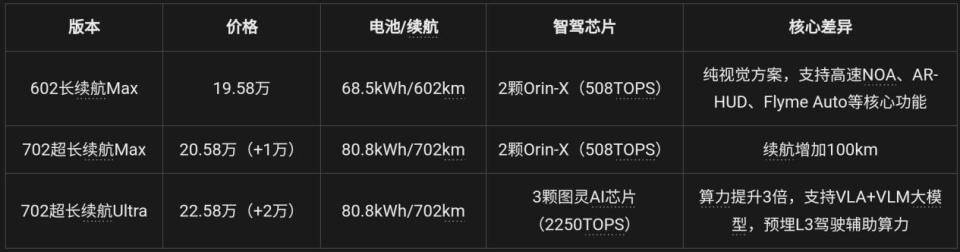 • 推薦理由:22.58萬元換來2250TOPS的恐怖算力,相當(dāng)于9顆Orin-X芯片,未來3年的智能駕駛升級空間全部預(yù)埋。VLA+VLM大模型能實現(xiàn)“老司機(jī)級”的駕駛決策,比如擁堵時合理加塞、主動避讓路面塌陷等,真正讓車“越開越聰明”。Flyme Auto車機(jī)系統(tǒng)在Ultra版上還額外搭載圖靈AI芯片,語音交互和多任務(wù)處理更流暢。