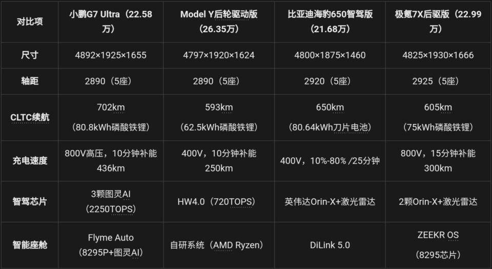 咱們再和競品比比看,小鵬G7在續(xù)航能力、補能效率,以及最重要的智駕、智艙硬件算力上有著非常大的優(yōu)勢。當(dāng)然了,補能效率和算力等賬面數(shù)據(jù)是一方面,實際表現(xiàn)如何咱們還得等實測。