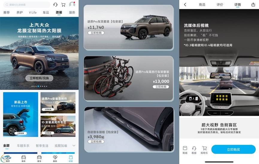 但其實上汽大眾的官方改裝業務,并不僅限于ID.家族,在上汽大眾超級APP的“好物”—“改裝”頁面里,包括途昂Pro等上汽大眾全系產品,都可以自選個性化改裝及配附件選購,涵蓋了外觀、內飾、智能科技、戶外裝備等多元領域——雖然小編沒能仔細翻閱是否有車規級紙巾盒,但上汽大眾官改配附件的豐富程度,足夠讓大家一站式完成在店選購安裝,免去了再跑汽車美容店的繁瑣。