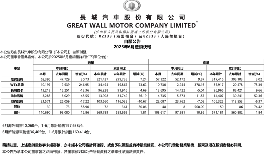 近日,長(zhǎng)城汽車(chē)對(duì)外發(fā)布了2025年6月以及其上半年的產(chǎn)銷(xiāo)快報(bào)。根據(jù)公布的數(shù)據(jù)顯示,6月長(zhǎng)城汽車(chē)的銷(xiāo)量為11.06萬(wàn)輛,新能源車(chē)銷(xiāo)量為36405輛;今年上半年,長(zhǎng)城汽車(chē)?yán)塾?jì)銷(xiāo)量為56.97萬(wàn)輛,其中新能源車(chē)銷(xiāo)量為16.04萬(wàn)輛,作為對(duì)比,比亞迪上半年汽車(chē)銷(xiāo)量為214.95萬(wàn)輛。