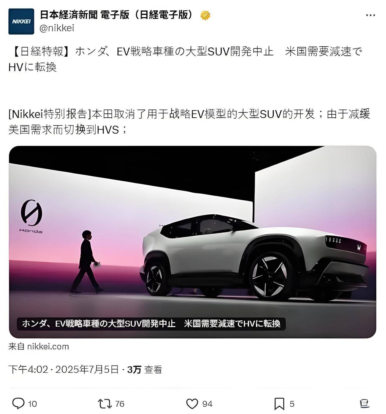 當整個行業都在為電動化搖旗吶喊時,本田卻在7月5日,來了一腳“急剎車”,宣布“放棄開發大型電動SUV”,轉而將資源集中到混動車型上。