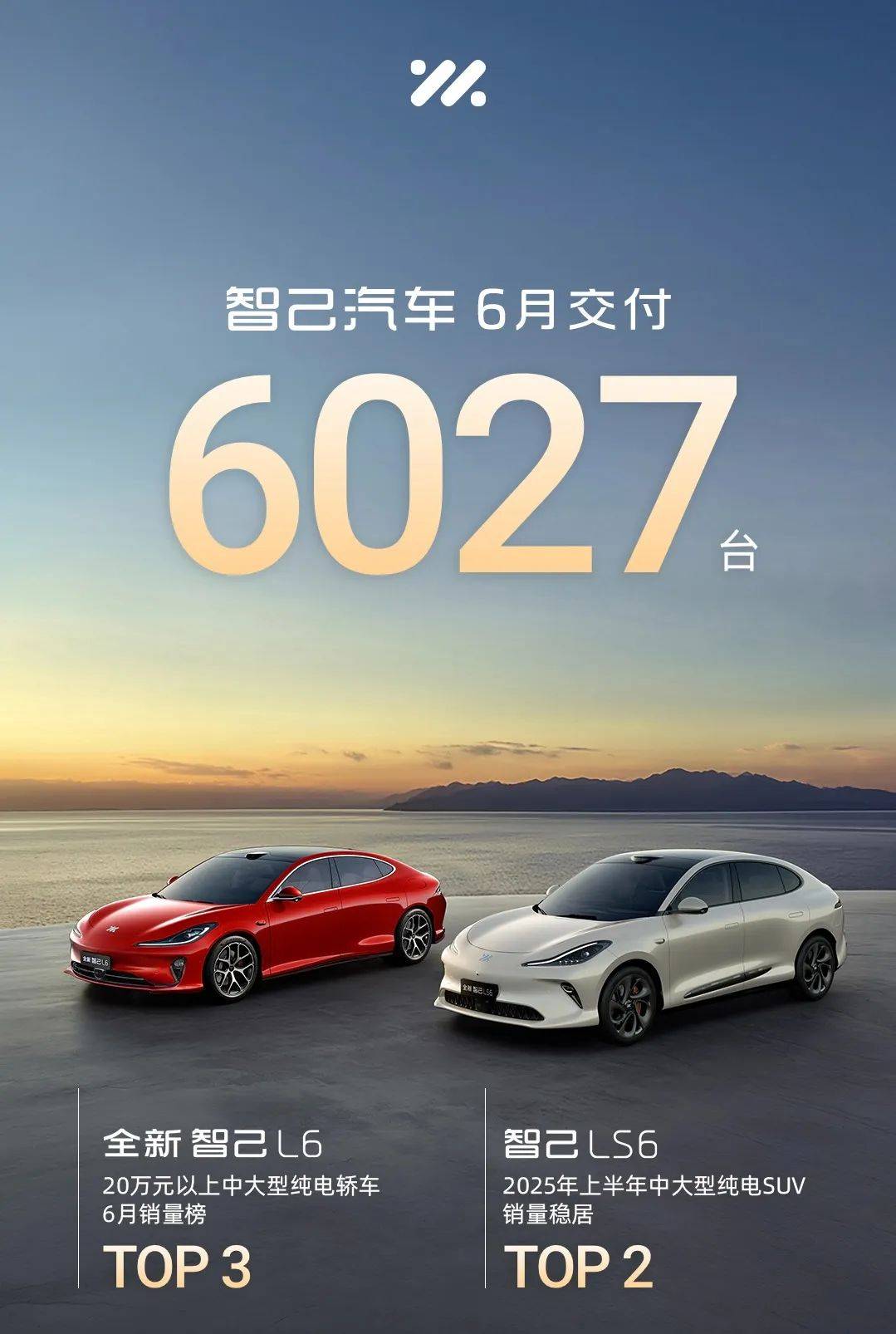 智己汽車6月交付量為6027臺,“雙6系”車型(智己LS6與全新智己L6)成為主要的銷量貢獻者,并且在純電細分市場站穩腳跟。其中,全新智己L6成功躋身20萬元以上中大型純電轎車6月銷量榜TOP3,將極氪001,阿維塔12等主流競品甩入身后;智己LS6,則在2025年上半年累計銷量穩居中大型純電SUV市場TOP2,力壓小鵬G9、蔚來ES8,釋放著“大廠國家隊”的實力。