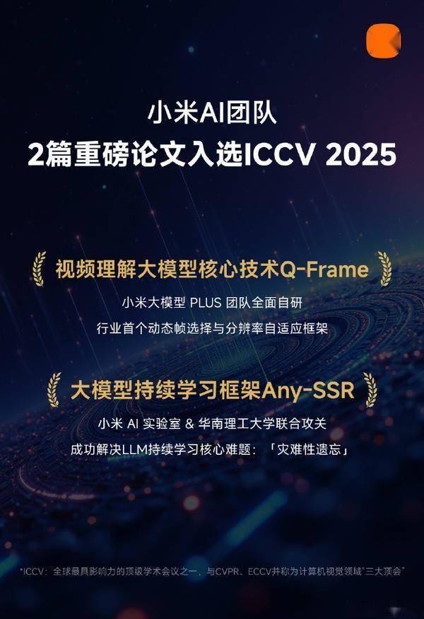 據悉,此次小米入選的2篇論文,一個是視頻理解大模型核心技術Q-frame,它由小米AI團隊自主研發完成,是行業首個動態幀選擇與分辨率自適應框架,也是首個無需訓練、各類視頻理解大模型基座即插即用的算法。另一個是大模型持續學習框架Any-SSR,它由小米AI團隊和華南理工大學聯合攻關,成功解決了大語言模型在持續學習領域的核心難題——“災難性遺忘”問題,實現了近乎完美的知識保留,同時能無縫學習新知識。