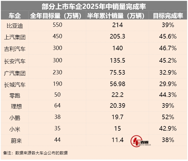 從數據上看,上汽集團2025年1-6月累計銷量205.3萬輛,目標完成率為45.6%;吉利汽車半年累計銷量140萬輛,目標完成率為46.7%;長安汽車半年累計銷量135.5萬輛,目標完成率為45.3%。