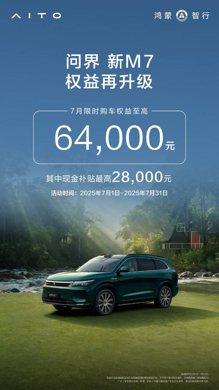 產品力是基礎,真金白銀的實惠才是促成決策的“臨門一腳”。7月問界 新M7的限時權益堪稱重磅炸彈: