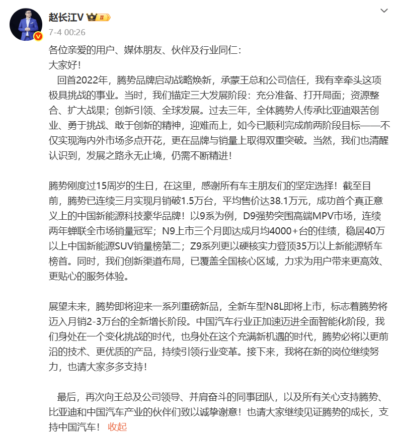 隨后,趙長江本人在微博發布長文,盡管未直接提及此次調任,但仍被外界普遍視作其在騰勢的“告別信”。