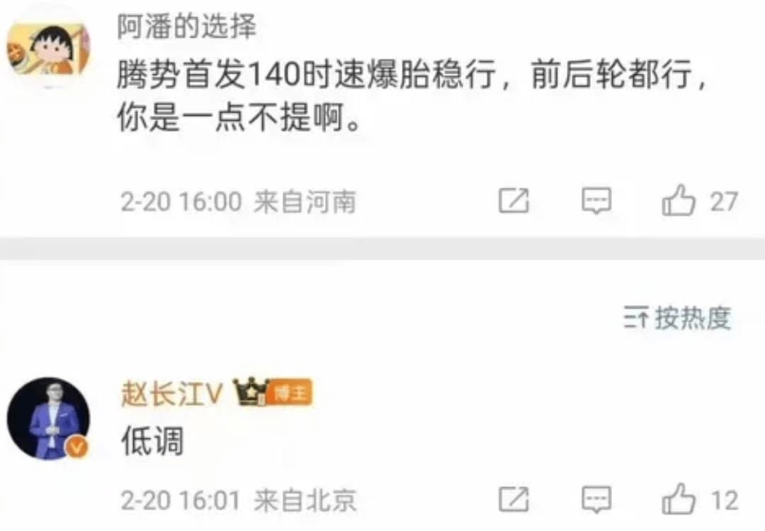 今年2月,尊界S800大力宣傳其爆胎安全性能時,有網友質疑為何騰勢Z9率先實現140km/h爆胎穩行技術卻未積極宣傳,趙長江僅以“低調”回應,引發網友批評。