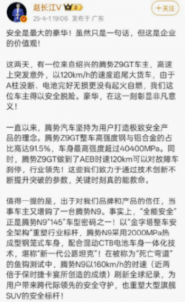 4月初,小米SU7高速事故發生后不久,趙長江發布關于騰勢Z9GT安全性能的微博,雖未直接提及小米,但由于時機敏感,被質疑“蹭熱度”,隨即刪帖。