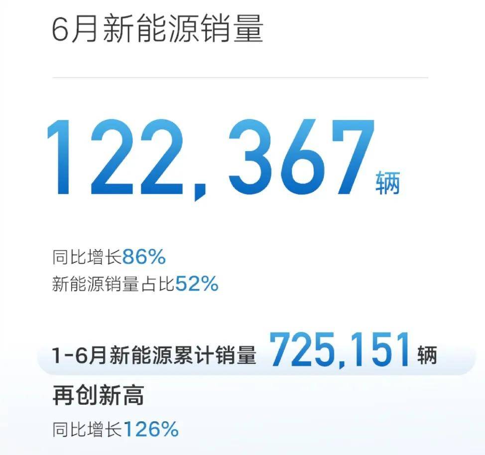 6月份,吉利汽車新能源銷量122,367輛,同比增長86%,占比52%;1-6月累計(jì)銷量725,151輛,同比增長126%,占比51.46%。也就是說,在吉利的銷量構(gòu)成里,燃油車和新能源車各占一半。