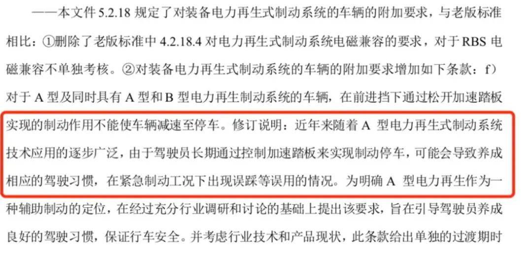 其中關(guān)于車輛制動,再次有明文規(guī)定“在默認(rèn)工作狀態(tài)下,僅通過松開加速踏板實(shí)現(xiàn)的制動作用不應(yīng)使車輛減速至停車”。