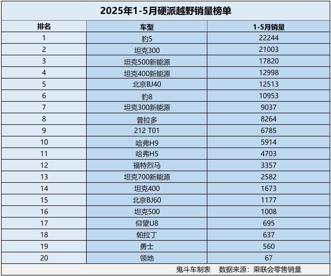 鬼哥查看乘聯會零售銷量數據看到,1-5月份,累計零售銷量超過萬輛的硬派越野車,僅僅有6款,很多網友們對于這種車型深深關注,但購車時往往不是最后的“選項”。接下來,看看具體車型銷量排名?