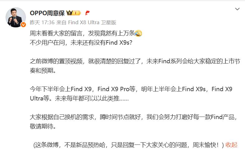 近日,OPPO Find 系列產品負責人周意保在微博與網友互動中透露了未來 OPPO Find X9 系列的更新計劃。盡管周意保稱這并非產品預熱,但仍然給出了清晰的產品線規劃。其表示 Find X9、 Find X9 Pro 將會在今年下半年發布,而 Find X9s、Find X9 Ultra 將會在明年上半年迎來更新。