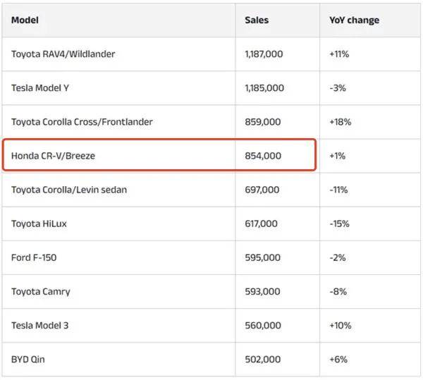 另一個日系品牌,旗下的也出現(xiàn)在榜單中,以85.4萬輛的銷量位居第四。算下來,日系車在2024年全球單一車型銷量榜TOP10中,一共占據(jù)6個名額,你們就說日系車是不是贏麻了?