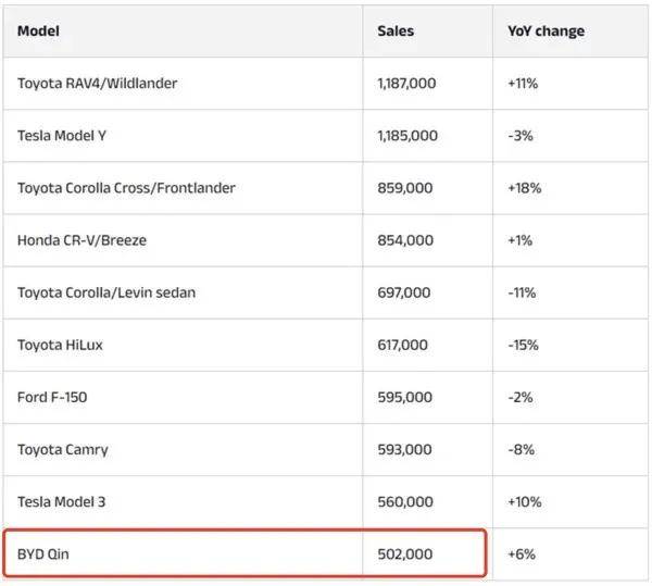 特斯拉Model Y、Model 3都在榜單上,但是位次不如2023年,不過依舊是全球純電車的老大。