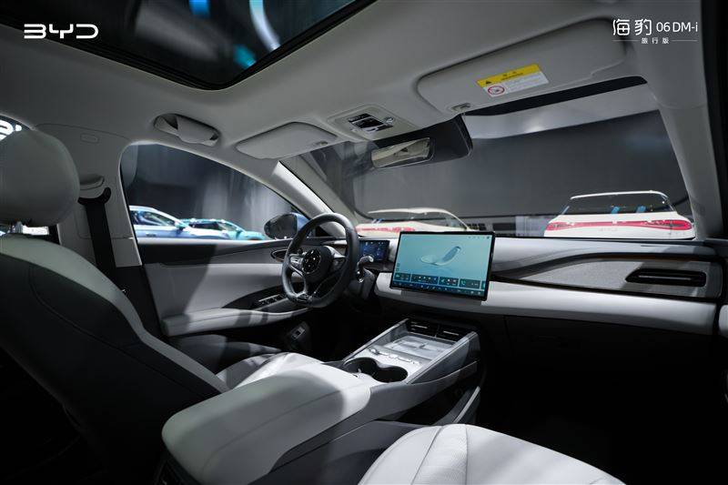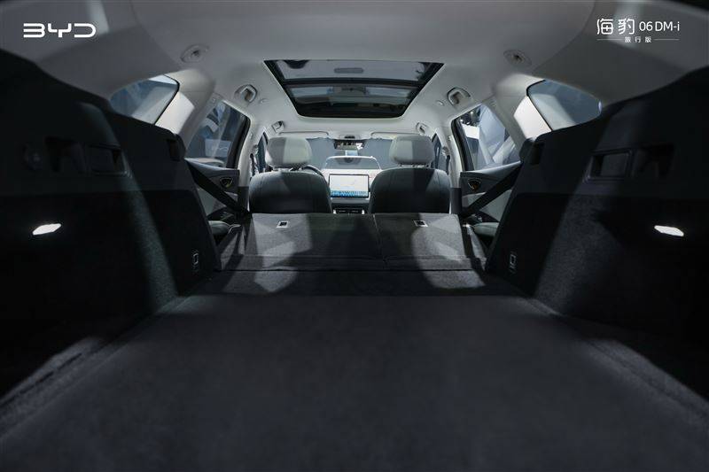 進入車內(nèi),海豹06DM-i旅行版的車廂還是熟悉的布局,各種曲線的運用顯得十分靈動,與三廂版車型不同的是,新車采用了懷擋設(shè)計,為中控臺騰出了更多空間。配備方面,除了12.8英寸中控屏和帶遮陽簾的全景天窗,海豹06DM-i旅行版全系標配前排座椅加熱通風、電動尾門以及車載冰箱,比三廂版豐富不少。至于旅行版的精髓部分,這臺車后備廂常規(guī)容積相比三廂版550L的提升了100L達到650L,而且可以通過放倒后排座椅的方式將后備廂儲物空間進一步擴展至1535L。