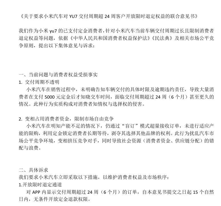 此背景下,“成年人要為自己的決定負責”“退定金是巨嬰”等論調,因忽視特殊情境與小米交付體系的信息不透明,顯得不太被預定YU7的用戶接受。