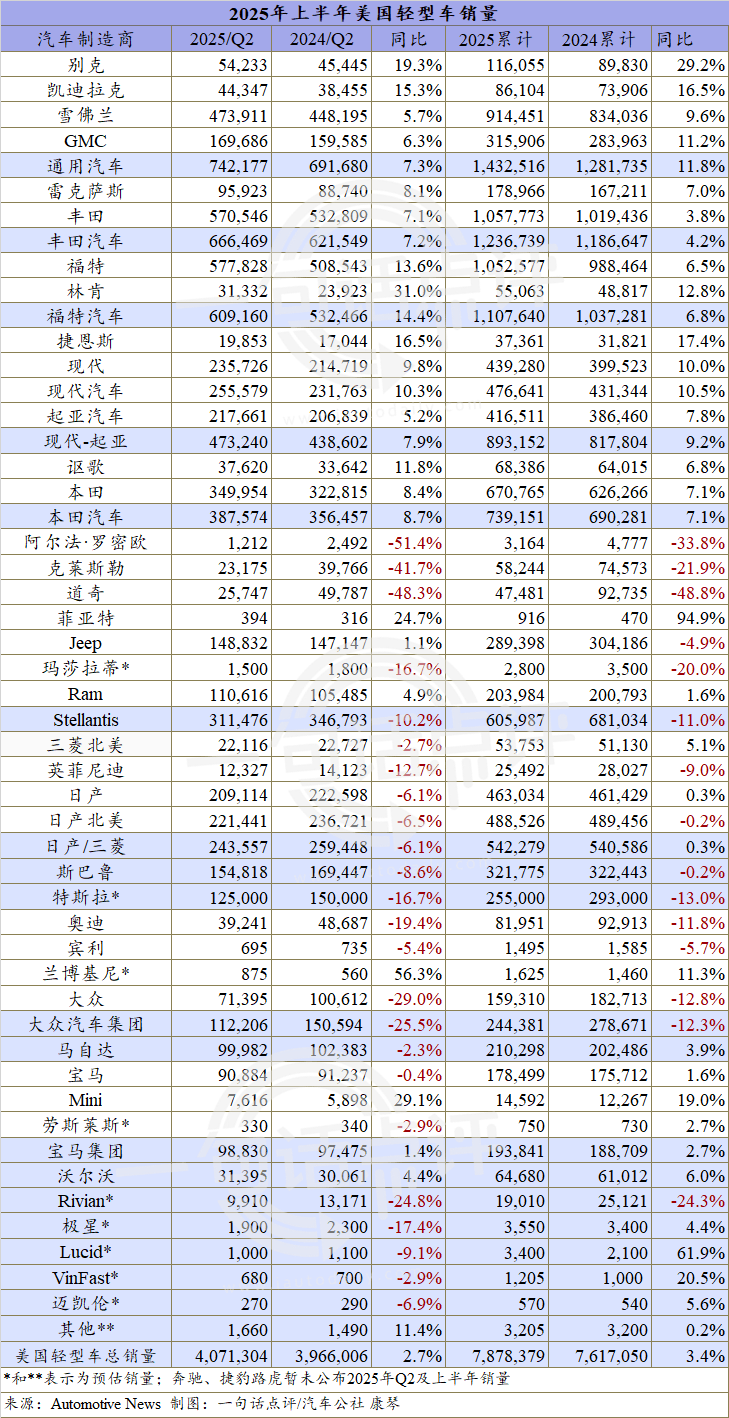 根據目前Autonews統計已公布銷量的大多數車企數據,上半年美國輕型車新車市場銷量約為787.8萬輛,同比增長3.4%,其中二季度的增幅為2.7%。