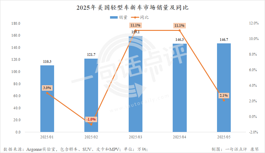 美國能源部Argonne實驗室公布的數據顯示,今年3月至5月美國輕型車新車銷量分別為159.1萬輛、146.2萬輛和146.7萬輛,這是自2021年同期之后該市場首次連續3個月銷量均超過140萬輛。