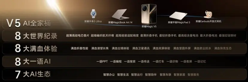 表面看,是產(chǎn)品力的勝利。榮耀已連續(xù)三年蟬聯(lián)全球折疊屏輕薄紀錄,Magic V5更是創(chuàng)造了折疊態(tài)8.8mm、重217g的行業(yè)新紀錄,在“輕薄,長續(xù)航,精致可靠”這個不可能三角上實現(xiàn)了破局。但往深處看,這背后是榮耀過去三年在產(chǎn)品理念、智能制造、AI戰(zhàn)略三個層面,壓強式、馬拉松式持續(xù)投入的必然結(jié)果。