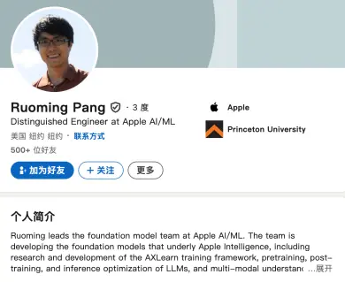 這也是一名華裔,名叫Ruoming Pang,是蘋果基礎模型團隊(Artificial Intelligence Models,AFM)的負責人。