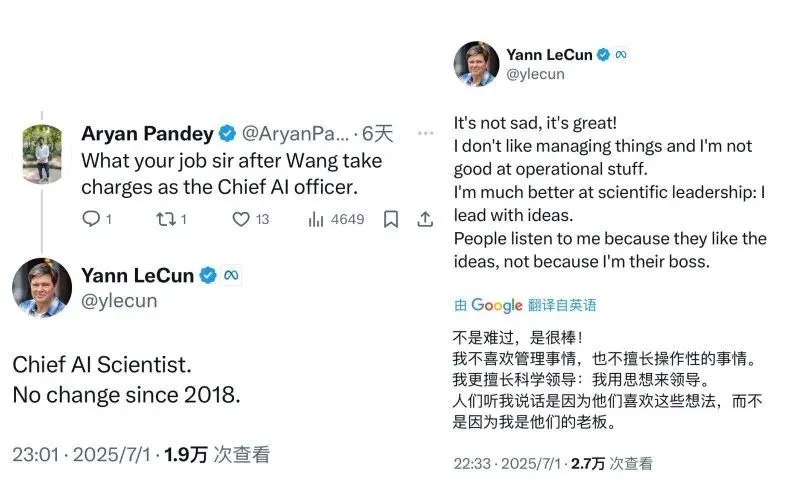 楊立昆有兩則回應,一則是強調自己是從2018年起就是首席人工智能科學家,沒有變過。一則是表示自己確實不擅長管理,更擅長科學方面的領導。