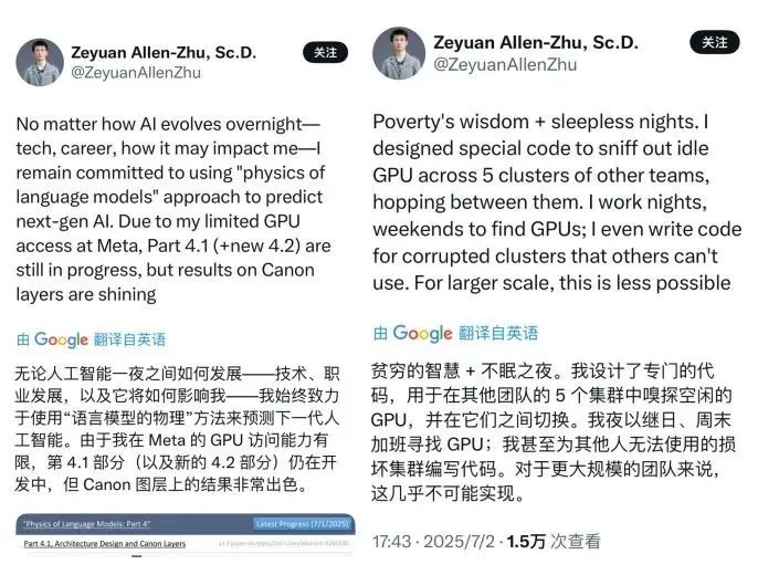 Zeyuan Zhu自己在X上,就多次提到FAIR團隊的“GPU訪問能力有限”。甚至提到,自己為此設計了專門的代碼,“用于在其他團隊的5個集群中嗅探空閑的GPU,并在它們之間切換”。