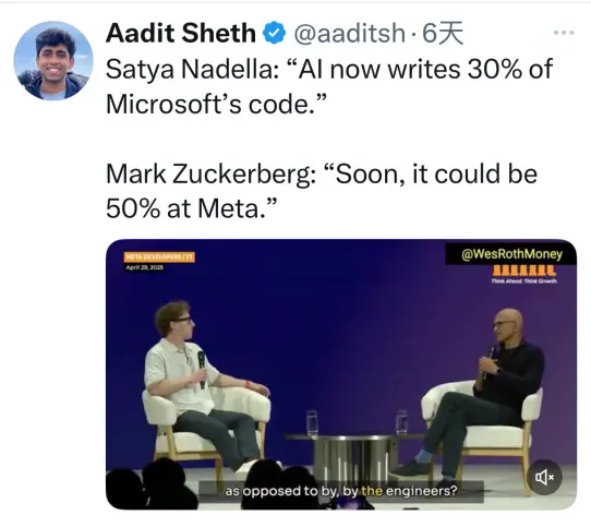 其中納德拉表示,現在微軟30%的代碼都是AI寫的。