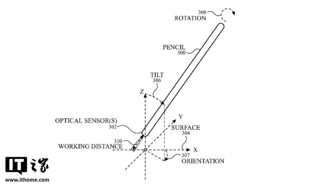 該專利名為《帶有光學(xué)傳感器的輸入設(shè)備》,概述了Apple Pencil設(shè)計(jì)方案,可以在任何表面甚至是其上方使用。該技術(shù)不再依賴和iPad內(nèi)部的傳感器互動(dòng),而是將所有傳感器移至Apple Pencil內(nèi)部。